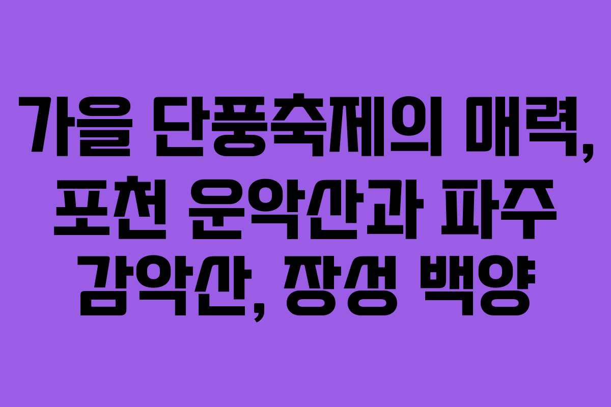 가을이 오면 많은 사람들이 단풍을 즐기기 위해 축제로 향합니다. 이번 글에서는 경기도 포천 운악산, 파주 감악산, 그리고 전라남도 장성 백양에서 열리는 단풍축제에 대해 소개합니다. 각 축제의 일정과 프로그램을 알아보며, 가을의 아름다움을 만끽할 준비를 해보세요.