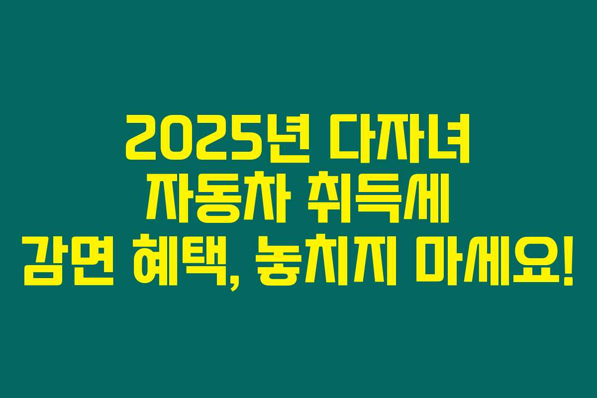 2025년부터 다자녀 가구와 친환경 자동차 구매자에게 제공되는 자동차 취득세 감면 혜택이 크게 확장되었어요. 특히 자녀 수에 따라 달라지는 다양한 혜택을 잘 활용하면 세금 부담을 크게 줄일 수 있답니다. 아래를 읽어보시면 다자녀 가구가 어떻게 자동차를 구매할 때 혜택을 받을 수 있는지, 자세히 알아볼 수 있어요!