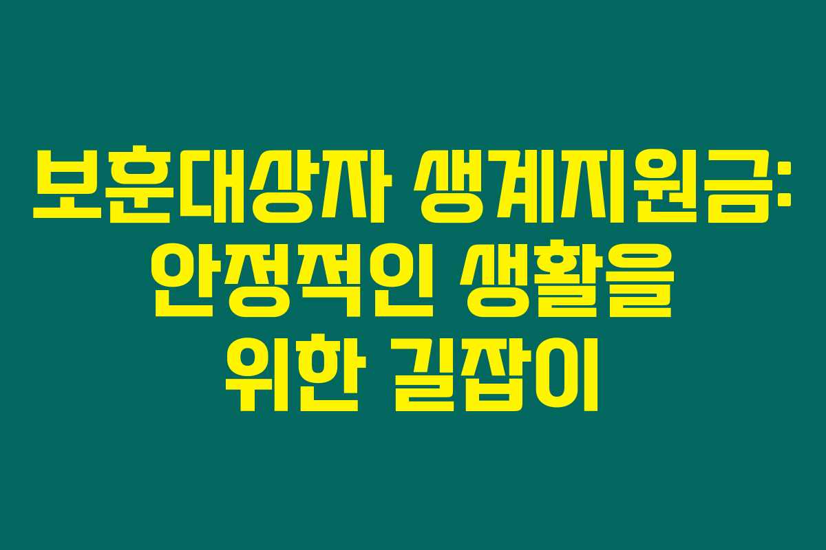 제가 직접 알아본 바로는, 보훈대상자 생계지원금은 저소득 고령의 보훈대상자에게 제공되어 안정된 생활을 돕는 매우 중요한 제도입니다. 특히 이러한 지원제도는 삶의 질을 향상시키고자 하는 이들에게 큰 도움이 될 수 있답니다. 아래를 읽어보시면 이 지원금의 지원대상, 선정기준, 신청방법, 그리고 혜택 등 여러 정보를 자세히 알 수 있습니다.