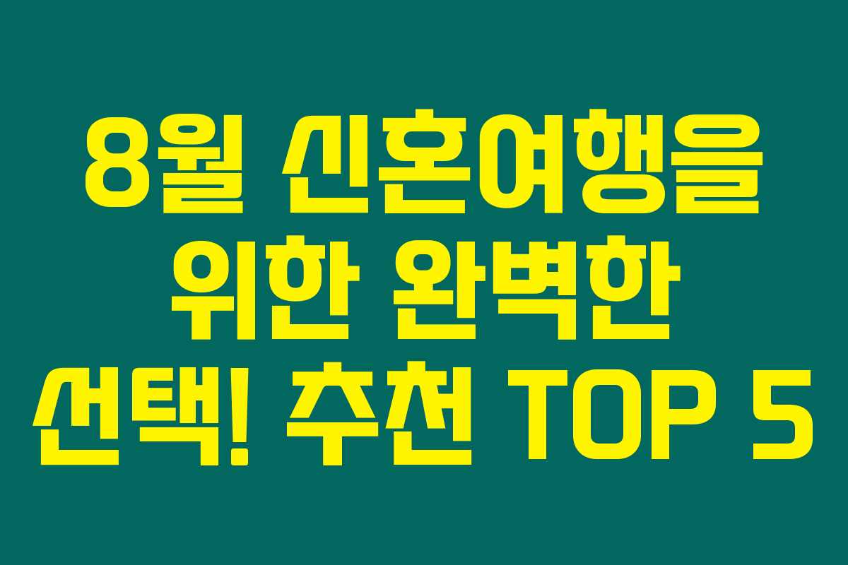 8월에 신혼여행을 떠날 계획이라면, 어떤 목적지들이 좋을지 고민이 많으실 거예요. 이 시기에는 따뜻한 날씨와 다양한 액티비티를 즐길 수 있는 여행지가 많아서 선택의 폭이 넓답니다. 8월 신혼여행지 추천 BEST 5를 소개합니다. 과연 당신의 선택은 어떤 곳일지 함께 알아볼까요?