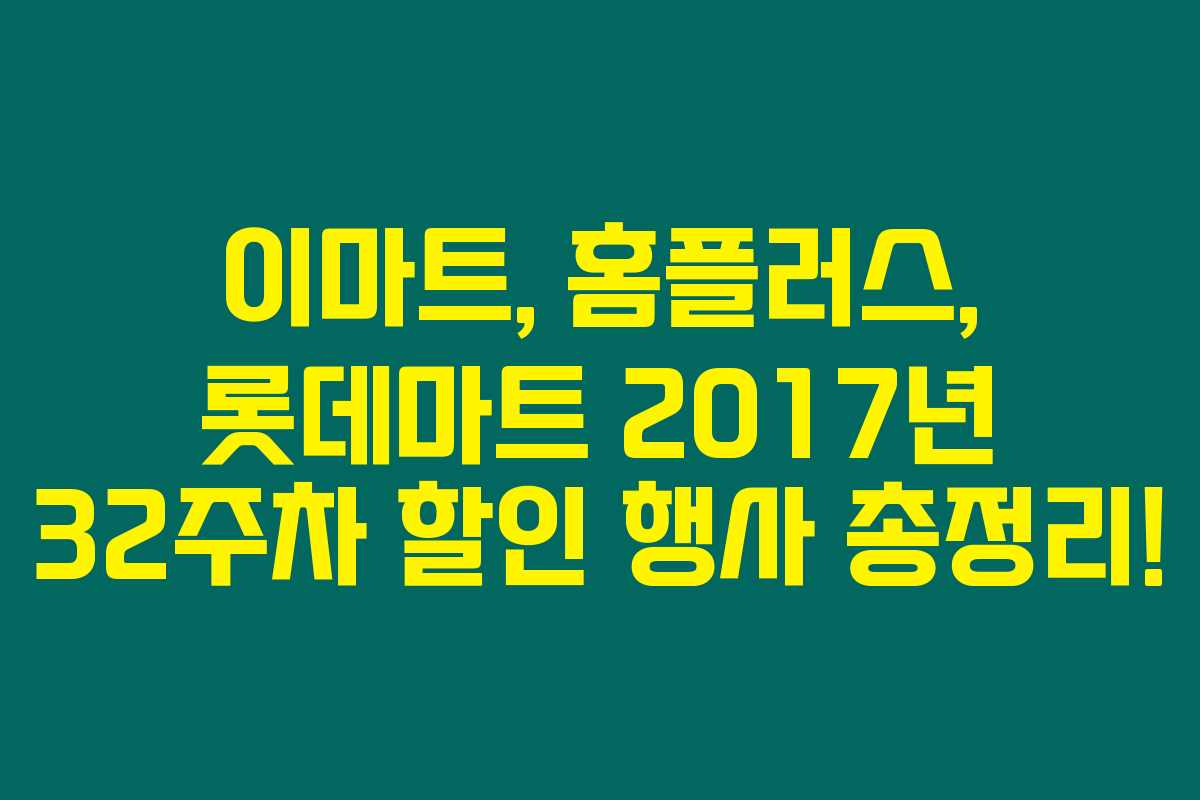 이번 32주차에는 이마트, 홈플러스, 롯데마트에서 대규모 할인 행사가 진행됩니다. 쇼핑을 떠나기 전에 어떤 상품들이 할인 중인지 미리 살펴보세요. 아래를 읽어보시면 꼭 필요한 혜택을 놓칠 일 없이 알찬 쇼핑이 가능할 거예요!