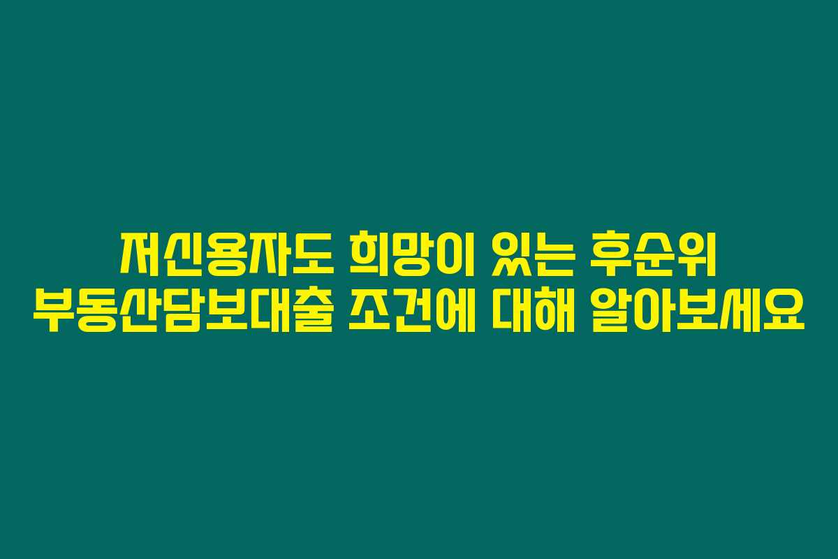 저신용자 부동산 담보대출이라는 것은 일반적으로 신용도가 낮아 은행 대출이 어려운 분들이 이용할 수 있는 대출 옵션이에요. 이 대출은 아파트와 같은 부동산을 담보로 하여 자금을 대출받는 방식입니다. 후순위 대출은 소유하고 있는 부동산의 가치에 따라 대출한도가 결정되어요.